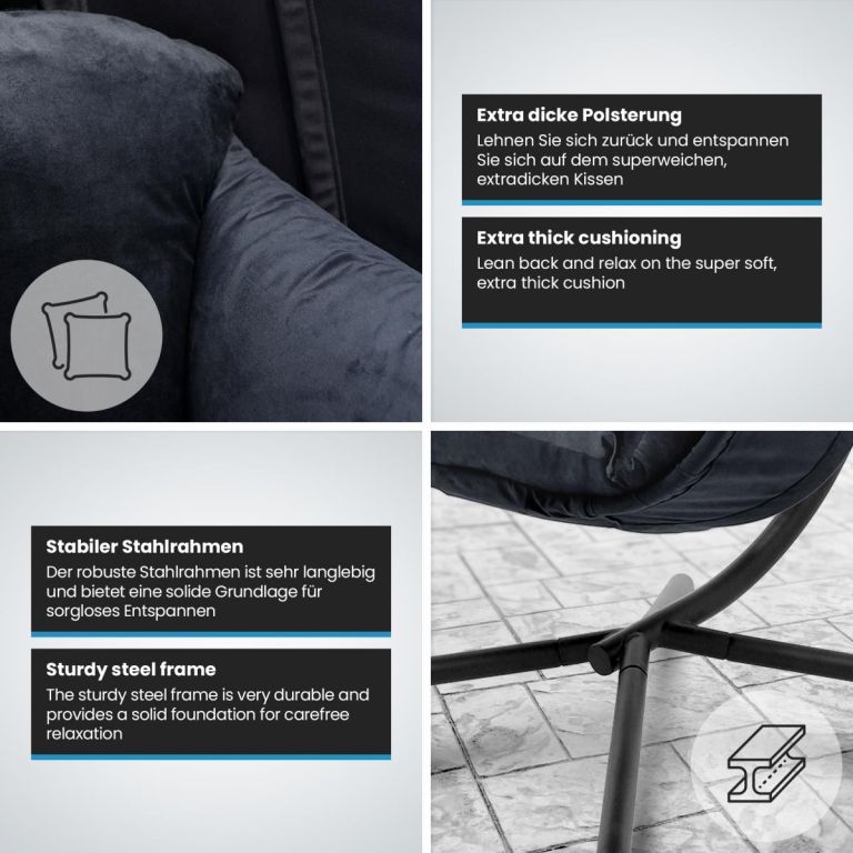 Nasze wysokiej jakości wiszące krzesło to coś więcej niż tylko miejsce do siedzenia, to idealne połączenie komfortu i stylu dla każdej przestrzeni zewnętrznej. Wsparty na solidnej żelaznej ramie o imponującej nośności 160 kg, fotel zapewnia nie tylko wytrzymałość, ale także niezawodną stabilność. Regulowana wysokość naszej wiszącej huśtawki zapewnia wszechstronność relaksu. Teraz możesz dostosować pozycję siedzenia do swoich upodobań. Żelazny kosz do siedzenia jest uzupełniony miękkimi poliestrowymi poduszkami, które zapewniają nie tylko wsparcie, ale także dodatkowy komfort. Dodaj odrobinę wyrafinowania do swojego życia na świeżym powietrzu dzięki temu eleganckiemu i funkcjonalnemu wiszącemu fotelowi.