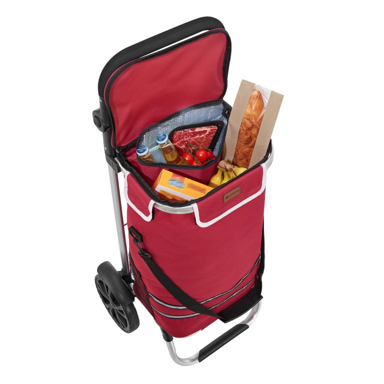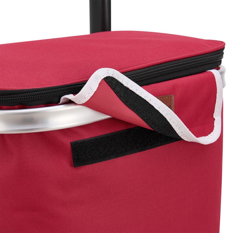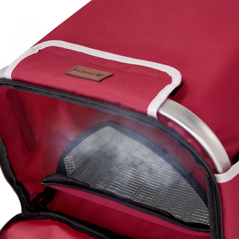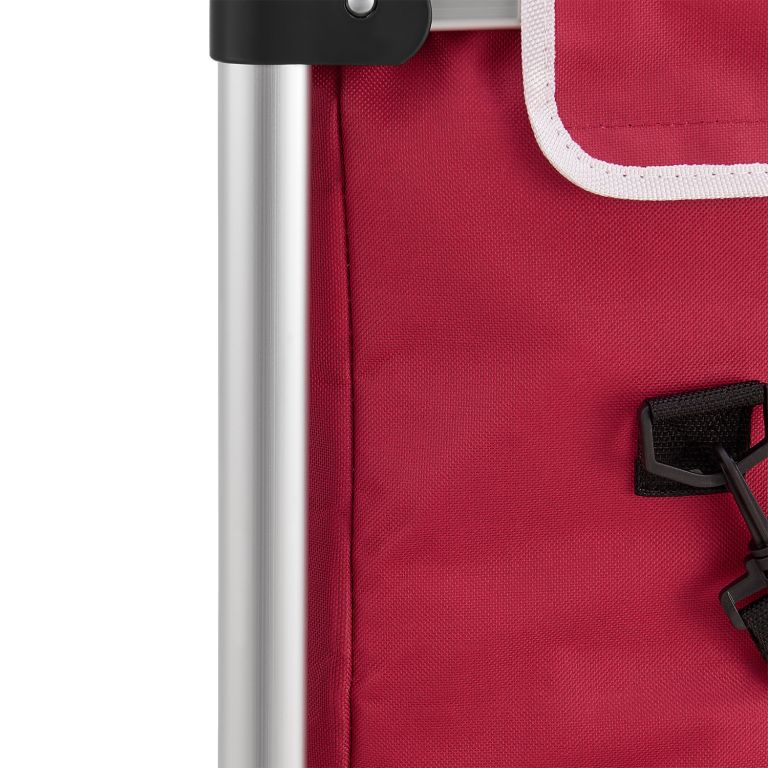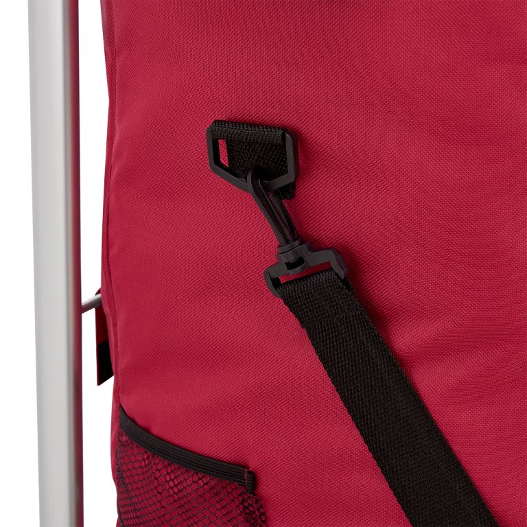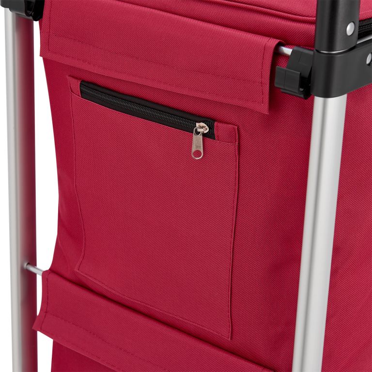 Zakupy mogą być lekkie i przyjemne! Czerwony wózek na zakupy z boczną kieszenią pozwoli Ci wygodnie przenosić nawet cięższe produkty. Poręczna kieszeń pomieści butelkę wody lub drobiazgi, które chcesz mieć zawsze pod ręką. To praktyczne rozwiązanie na zakupy, wyjazdy na targ czy spacery.