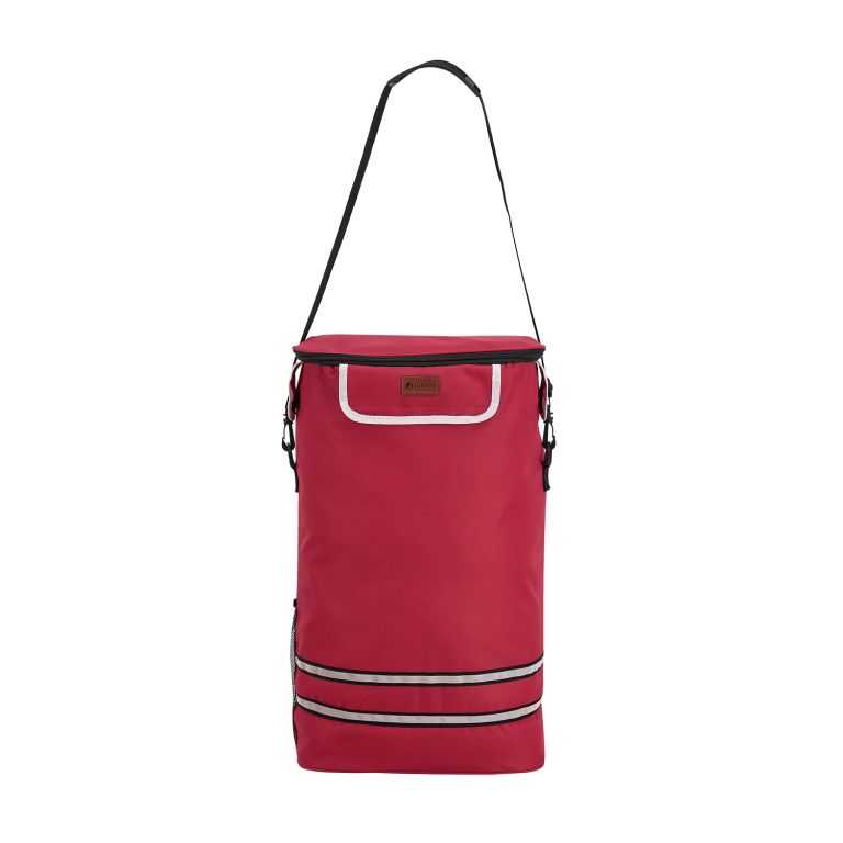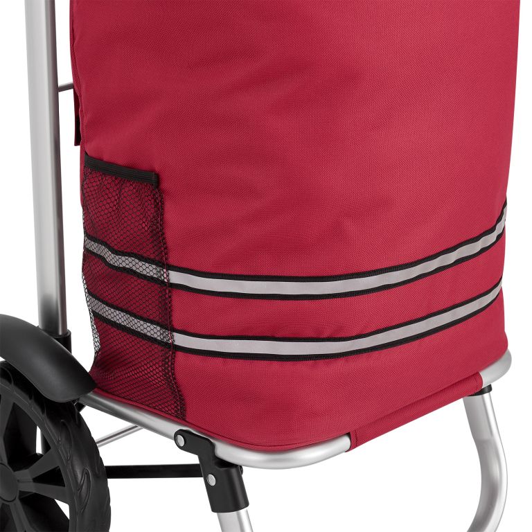 Czerwony wózek na zakupy z kieszenią boczną i odblaskami – wygoda i bezpieczeństwo na każdym kroku.