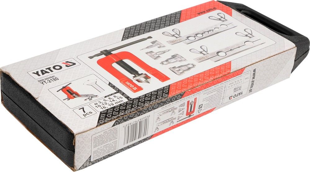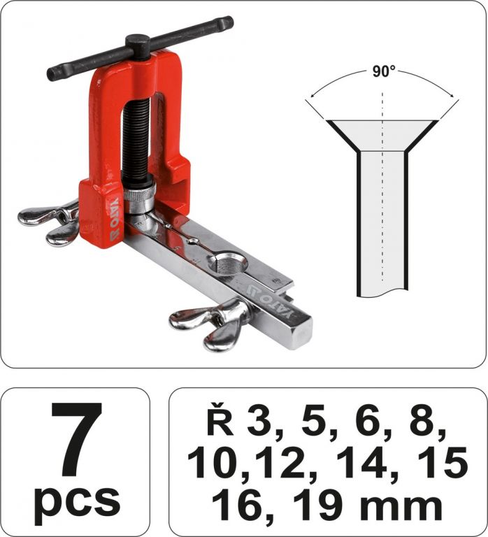 Zaciskarka do ręcznego rozszerzania rur i formowania stożkowych połączeń kołnierzowych o kącie wierzchołkowym 90°. Uchwyt jest gotowy do pracy ze stopniowanymi, znormalizowanymi średnicami rur 3; 5; 6; 8; 10; 12; 14; 15; 16 i 19 mm.
