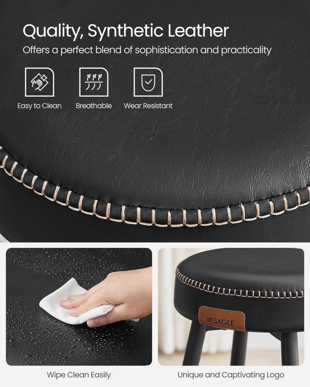 Hokery wyposażone są w łatwą do czyszczenia tapicerkę z ekoskóry oraz solidne metalowe nogi z antypoślizgowymi stopkami. Miękkie siedzisko gwarantuje wygodę, a prosty montaż pozwala cieszyć się nimi od razu po rozpakowaniu.