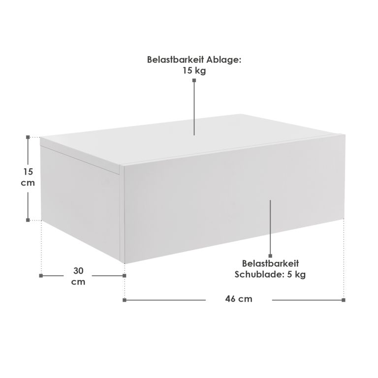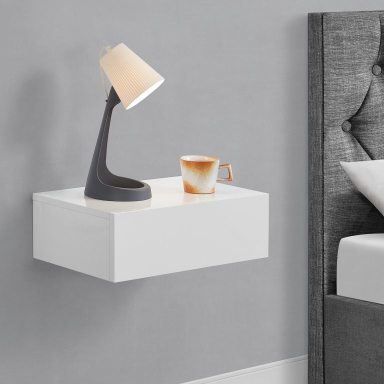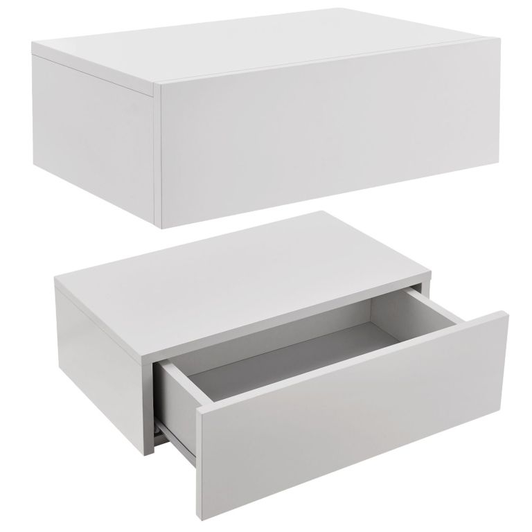 Nadaj swojej sypialni nowoczesny i lekki charakter dzięki zestawowi 2 wiszących stolików nocnych w białym kolorze. Dzięki montażowi na ścianie oszczędzają miejsce, ułatwiają sprzątanie i prezentują się elegancko nawet w mniejszych pomieszczeniach. Górny blat służy jako praktyczna powierzchnia do odłożenia lampki, książki czy szklanki wody, natomiast szuflada zapewnia miejsce na drobiazgi, które chcesz mieć pod ręką, a jednocześnie dyskretnie ukryte.