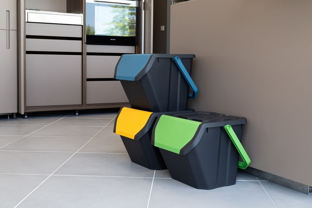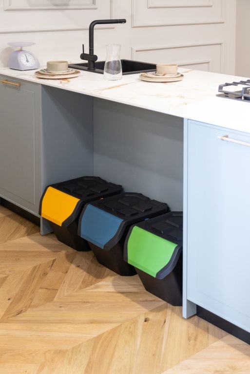 Zestaw trzech sztaplowanych koszy na śmieci FRIDA o pojemności 3 x 25 l to idealne rozwiązanie do wydajnego sortowania odpadów nie tylko w domu, ale t