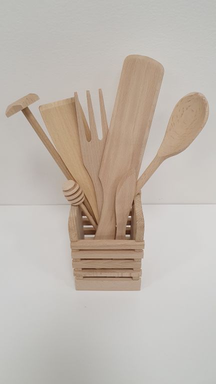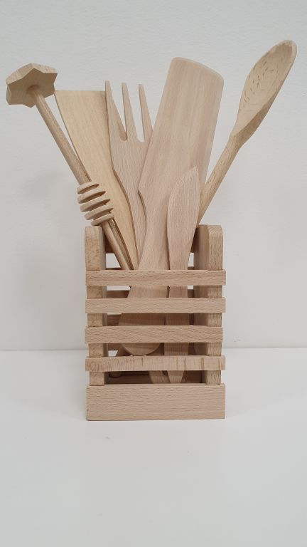 Zestaw drewnianych przyborów kuchennych w stojaku