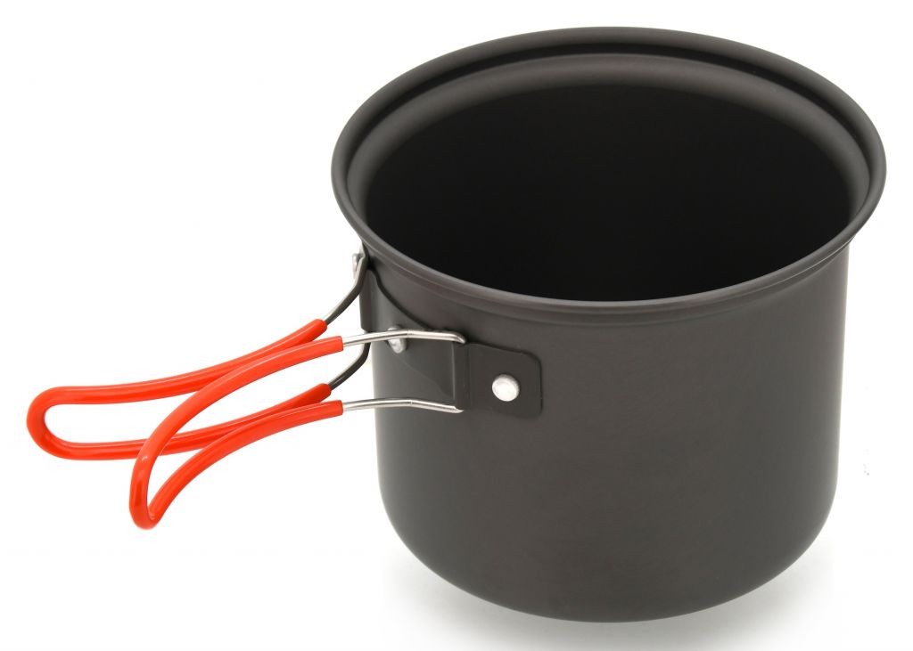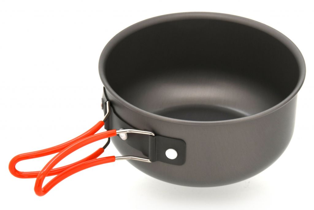 Zestaw naczyń kuchennych z anodyzowanego aluminium na zewnątrz.