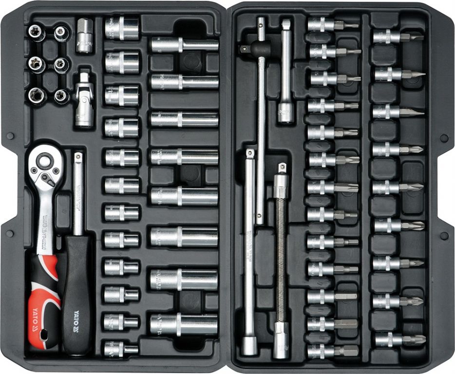 Zestaw Gola 1/4" zawiera 56 szt.: przedłużki, przedłużki, grzechotka z plastikowym uchwytem i inne akcesoria. Wykonany z wysokiej jakości stali CrV50BV30, CrV40, CrV6150, CrMo440 i S2 z funkcją AS-DRIVE. Grzechotka ma precyzyjny 72-zębowy skok Funkcja AS -DRIVE pozwala na rozwinięcie większej siły docisku, ponieważ kontakt ze śrubą nie następuje na krawędziach sześciokąta, ale w pierwszej trzeciej powierzchni styku, nie uszkadzając tym samym łba śruby.