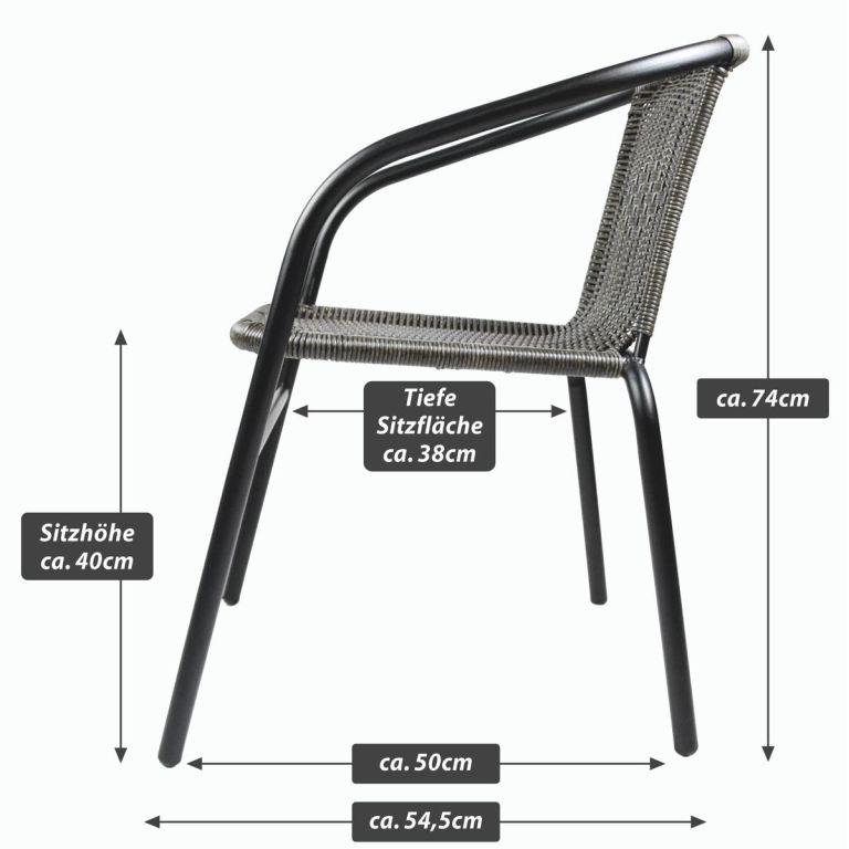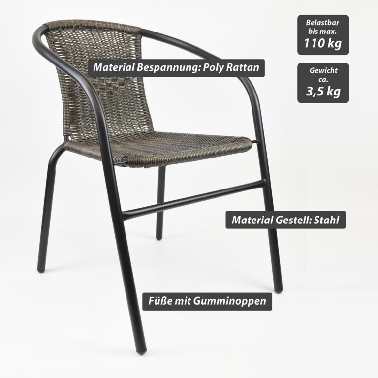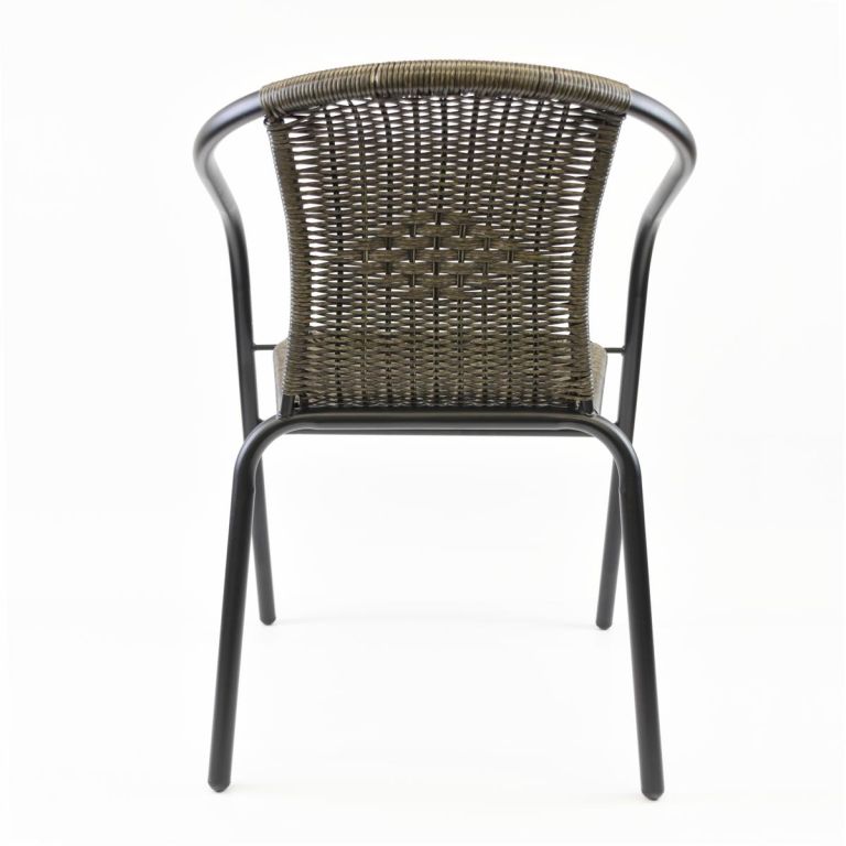 Bistro krzesła w stylu prawdziwej śródziemnomorskiej atmosfery, inspirowane francuskimi kawiarniami i bistrami, to lekki i elegancki element do siedzenia. Kilka takich krzeseł można na sobie ułożyć, oszczędzając w ten sposób miejsce, jeśli chce się je odłożyć i przechować na zimowe miesiące. Materiały użyte do produkcji tych krzeseł są łatwe w utrzymaniu, odporne na warunki atmosferyczne i nie wymagają specjalnych środków pielęgnacyjnych. Lekka, a jednocześnie solidna, stakowalna krzesło z wygodnym siedziskiem z rattanu jest bardzo komfortowa. Konstrukcja ze stali pokryta powłoką proszkową, a nogi mają gumowe nakładki, które zapobiegają ślizganiu się, tłumią hałas przy ruchu i chronią podłogę. Polirattan wykonany z plastiku jest odporny na rozdarcie i ma ciekawy splot. Połącz te stakowalne krzesła z odpowiednimi małymi okrągłymi stolikami bistro dostępnymi w naszym sklepie. W ten sposób możesz stworzyć własny zestaw bistro.