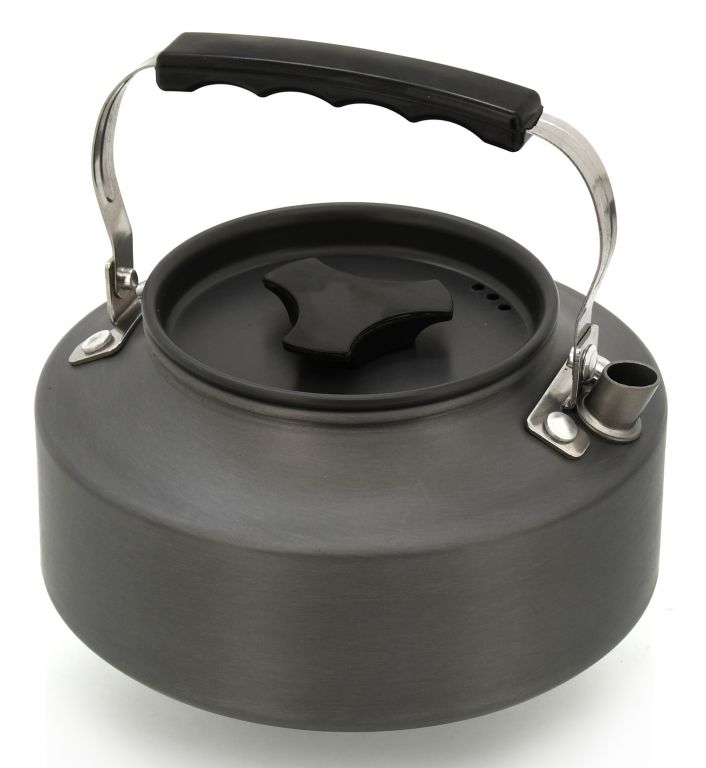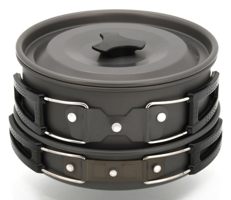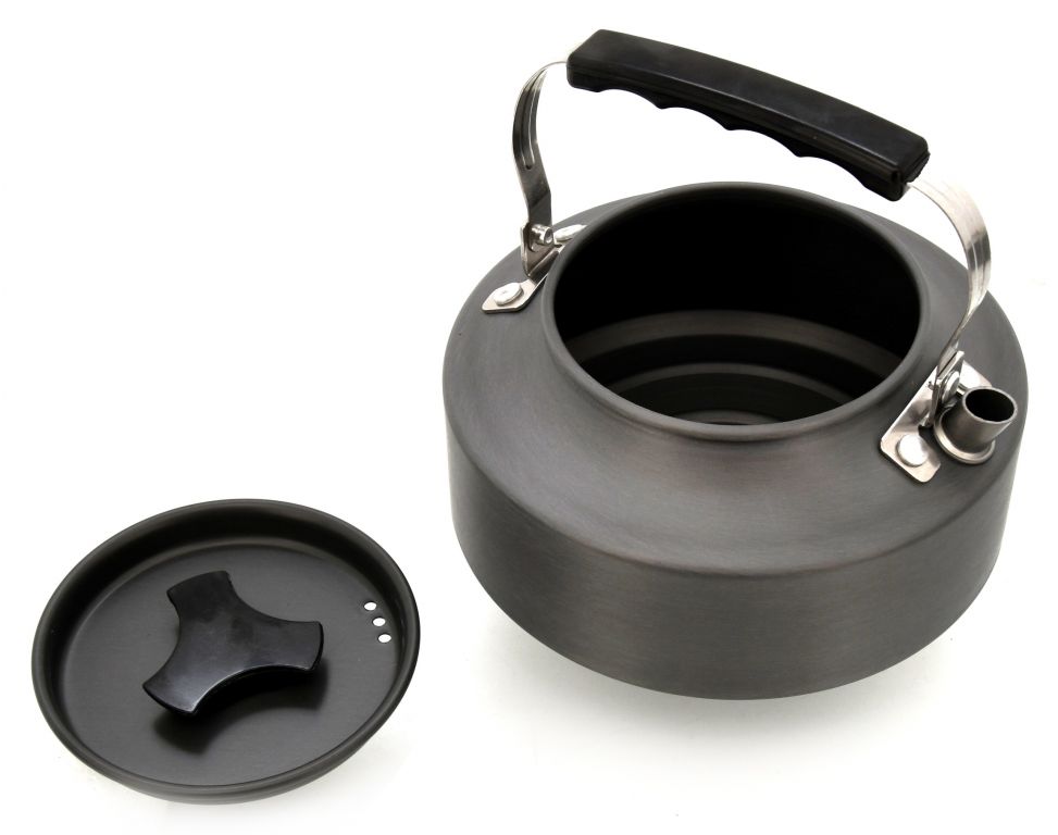 Zestaw składa się z patelni 18 x 4 cm, garnka 17 x 9 cm, czajnika 15 x 7,5 cm i wieka o średnicy 17 cm. Wszystkie urządzenia są wyposażone w składany uchwyt, wykończony plastikową rączką dla łatwej obsługi.