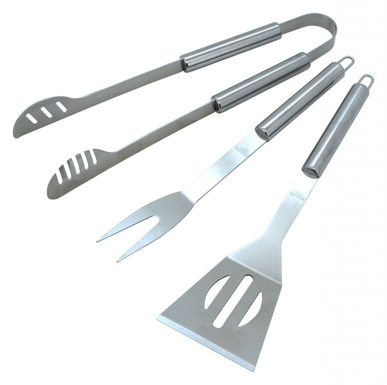Szczypce są specjalnie ukształtowane dla pewnej przyczepności do różnych potraw i mają 35 cm długości. Widelec o podwójnych zębach o długości 32 cm. Łopatkao średnicy 33 cm z precyzyjną krawędzią i otworami odpływowymi do obracania mięsa i innych potraw.