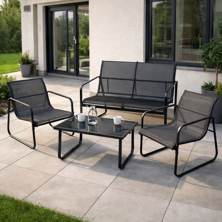 Ten zestaw ogrodowy składa się z dwóch foteli, sofy i stołu z półprzezroczystym szklanym blatem. Dzięki temu zestaw ten jest idealny do wspólnego śniadania, kolacji lub spotkania z całą rodziną w ogrodzie, na balkonie lub tarasie. Meble wykonane z połączenia stali i tkaniny charakteryzują się eleganckim wyglądem i praktyczną funkcjonalnością. Każde krzesło wykonane jest z lakierowanej na szaro stali i zachęca do wygodnego siedzenia. Siedzisko i oparcie krzeseł składa się z czarnego elastycznego pokrowca z tkaniny odpornej na warunki atmosferyczne. Jest to lekka, wytrzymała tkanina z tworzywa sztucznego, która jest łatwa w utrzymaniu i może wytrzymać wiele warunków pogodowych. Szklany stół jest bardzo stabilny, łatwy w czyszczeniu i ma blat wykonany z półprzezroczystego szkła bezpiecznego. Zaokrąglone, zakrzywione nogi sprawiają, że stół jest ciekawy wizualnie. Wytrzymała rama stołu jest również wykonana ze stali i ma wykończenie z szarego lakieru.