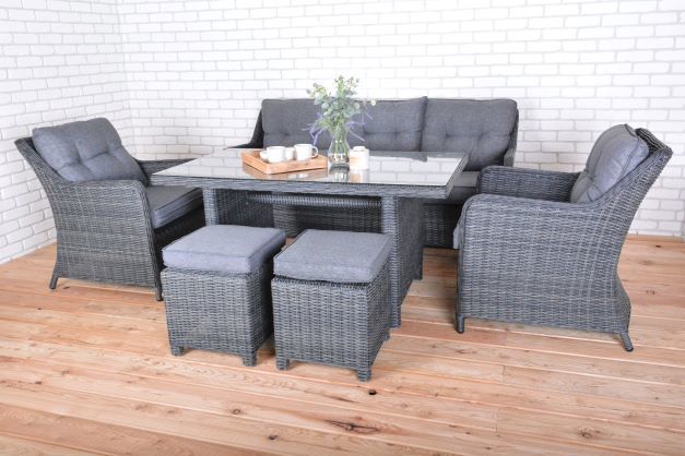 Najnowszym trendem w modzie nie tylko w dziedzinie mebli ogrodowych, ale także wyposażenia wnętrz są meble wykonane ze sztucznego rattanu. Chociaż sztuczny rattan przypomina naturalny rattan, jest znacznie trwalszy. Generalnie jest bardziej elastyczny i mniej podatny na uszkodzenia. Meble ogrodowe ze sztucznego rattanu wyróżniają się łatwością konserwacji i dużą odpornością na niekorzystne warunki atmosferyczne. Pokrowce są zdejmowane. Meble ze sztucznego rattanu nie odklejają się, nie tworzą się na nich nieestetyczne pęknięcia, zachowują kolor przez wiele lat. Jeśli nie chcesz, aby salon utrzymany był w tym samym duchu, co inne, rozwiązaniem mogą być meble rattanowe. Luksusowe meble z technorattanu mają naprawdę bardzo szerokie zastosowanie. Nadaje się do przestrzeni wewnętrznych i zewnętrznych, ogrodów, tarasów, oranżerii, balkonów, biur, sal konferencyjnych, recepcji i innych powierzchni komercyjnych i mieszkalnych. Nie musisz niczego montować ani montować - meble są gotowe do natychmiastowego użytku. Meble wykonane ze sztucznego rattanu są funkcjonalne, zmienne, przyjemnie się z nimi mieszka i cieszy. Luksusowy komplet wykonany z wysokiej jakości sztucznego rattanu odpornego na promieniowanie UV oraz temperaturę od + 50 ° C do -10 ° C. Stelaż aluminiowy + malowanie proszkowe. Rattan: półokrągły 6,5mm Blat stołu: szkło hartowane 5mm Poduszki: wypełnienie - pianka 10 cm, tkanina - poliester 230g / m2 - dolne poduszki wyposażone są w zamek błyskawiczny, który umożliwia łatwe pranie pokrowca