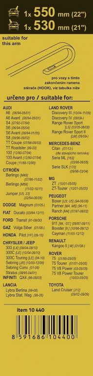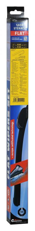 Komplet dwóch płaskich wycieraczek FLAT (kierowca + pasażer) ze specjalnym mocowaniem. Długości wycieraczek oraz system mocowania wieszaków są dostosowane do wybranych samochodów (patrz tabela zastosowań). Wysokiej jakości elastyczny płaski element zgarniający zapewnia równomierny docisk grafitowego ostrza na całej jego długości.