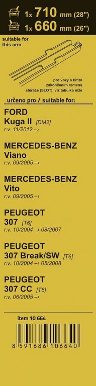 Komplet dwóch wycieraczek FLAT (kierowca + pasażer) ze specjalnym mocowaniem. Długości wycieraczek oraz system mocowania wieszaków są dostosowane do wybranych samochodów (patrz tabela zastosowań). Wysokiej jakości elastyczny, płaski element zgarniający zapewnia równomierny docisk grafitowego ostrza na całej jego długości.
